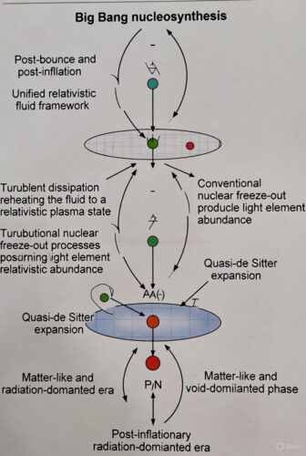 The mechanism aligns with the model’s turbulence paradigm: Planck-scale intermittency and high Reynolds number flows during the bounce and inflation dissipate via cascade processes, converting coherent motion into thermal energy (reheating). As density dilutes below a transition threshold, the fluid transitions to ultra-relativistic behavior dominated by kinetic energy of vortex excitations (interpreted as relativistic particles), yielding $p \approx \rho/3$. Subsequently, further expansion leads to non-relativistic clustering (matter-like, $w \approx 0$) and void dominance ($w \approx -1$).