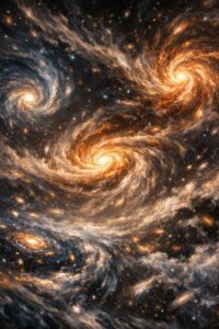 Here, Kelvin–Helmholtz instabilities come alive on a scale almost impossible to imagine. Unlike the small curls on a pond, these instabilities roll into spirals larger than galaxies. They generate turbulence that stirs the cosmic fluid, twists matter into filaments, and sculpts the grand web of galaxies across the universe. The cosmos, once thought to be calm and passive, becomes a churning ocean, constantly in motion, constantly mixing itself.