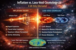 Lava-Void Cosmology (LVC) offers a fundamentally distinct resolution to these same problems without invoking new fields, exotic energy conditions, or superluminal expansion. Grounded exclusively in pure general relativity with viscous fluid stresses, LVC describes the early universe as emerging from a non-singular bounce governed by void-channeling dynamics and natural phase transitions between high-density Lava Phases and diluting Void Phases. As detailed in the Early Universe hub (Hub 5: Cosmogenesis), these viscous flows inherently produce the observed homogeneity and flatness through geometric relaxation in an expanding void-dominated medium, eliminating the need for an ad hoc inflationary epoch.