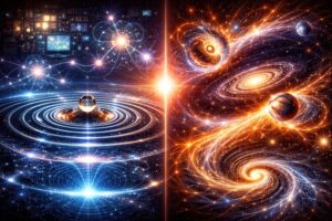 Split cosmic artwork showing chaotic quantum vacuum energy on the left and calm void-driven fluid universe on the right.