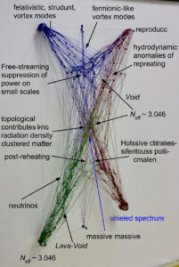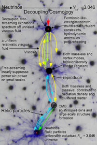 This mechanism unifies neutrinos with the broader fluid ontology: massive neutrinos arise from residual viscous binding or chiral mass generation in helical turbulence, contributing to clustered matter on small scales, while massless or ultra-light modes act as additional radiation density. The effective number of relativistic species N_eff ≈ 3.046 is reproduced by three families of such decoupled modes (plus minor contributions from turbulent residuals), with potential for sterile-like extensions if intermittency produces extra light degrees of freedom. Free-streaming suppresses power on small scales (below the free-streaming length), influencing structure formation, CMB anisotropies (via early ISW and phase shifts in acoustic peaks), and large-scale structure (consistent with Lyman-α and galaxy clustering constraints).
